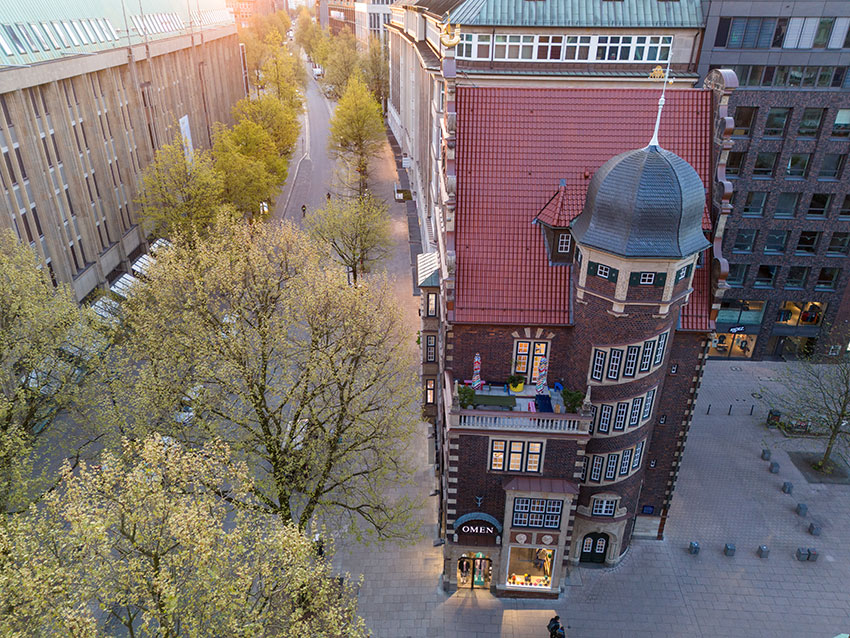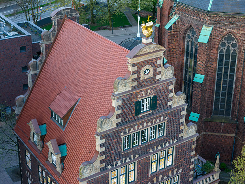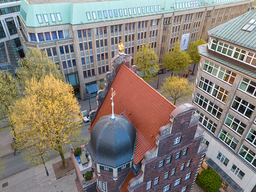Seitdem ist eines von Hamburgs schönsten denkmalgeschützten Gebäuden im Herzen der Innenstadt wieder wind- und wettergeschützt und macht bei Drohnenaufnahmen der Hamburger Innenstadt aus der Luft so richtig was her!