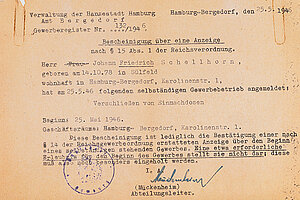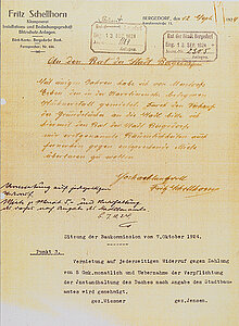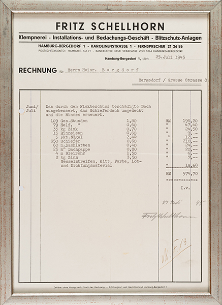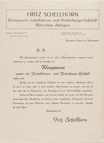 Die Firma Schellhorn hat auf dem Gelände des heutigen Bergedorfer Rathauses einen Hühnerstall als Werkstatt gemietet. Als das Gelände 1924 an die Stadt verkauft wird, beträgt die Miete für die Werkstatt 5,- Mark monatlich – und beinhaltet die unentgeltliche Instandhaltung des Daches.
