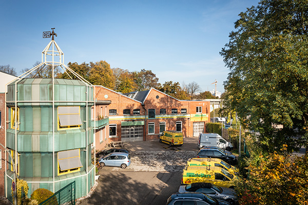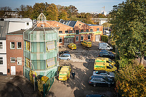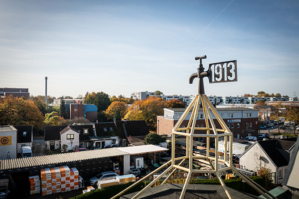 Die Bürogebäude werden um den markanten Eckturm erweitert. Der Turm wird mit in grün vorpatiniertem Kupferblech bekleidet und das Rohrgestänge sowie die Fensterrahmen in Gelb gestaltet, um das Firmengebäude mithilfe des markanten Corporate Designs noch stärker in einen Hingucker zu verwandeln. Zudem erhält der Turm einen Zapfhahn mit Gründungsjahr als Wetterfahne.