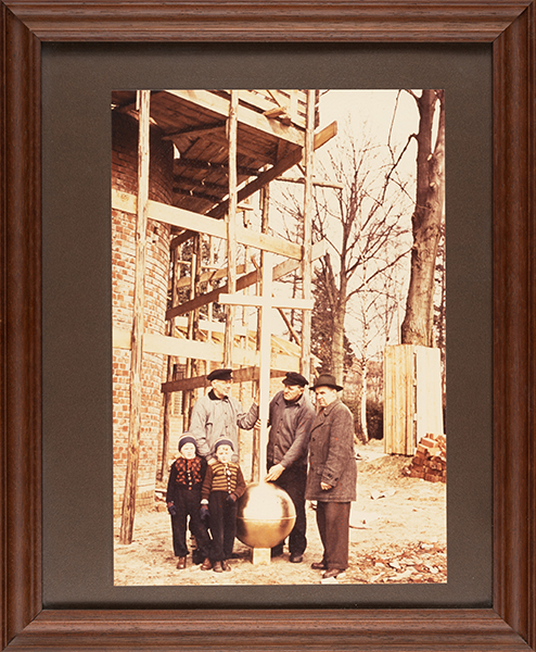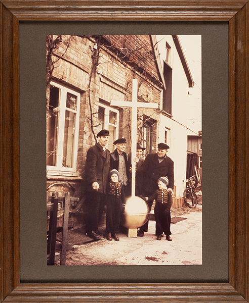 Die zweite Kirche in der Schellhorn-Tradition steht an: 1955 deckt Erich Schellhorn mit seinen Gesellen die St. Michael-Kirche auf dem Gojenberg. Die Kirche und der Turm werden mit Holzschindeln versehen und die goldene Kugel und das Kreuz montiert. Auf dem Foto ist Erich Schellhorn mit den beiden Söhnen Claus und Fritz sowie den Gesellen abgebildet.