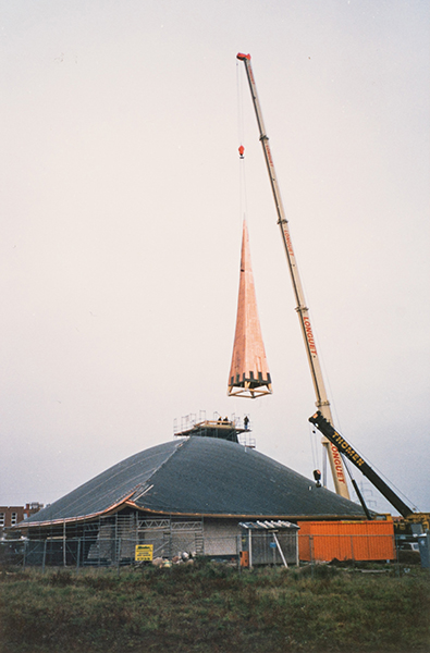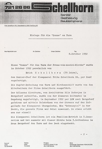 In Neu-Allermöhe entsteht die Franz-von-Assisi-Kirche und Fritz Schellhorn setzt die Tradition der Bekleidung von Kirchtürmen seiner Familie mit der 3. Kirche fort. Der 22 m lange Kirchenturm wird mit einem Telekran in den Hof gelegt und zusammen mit seinem Team bekleidet er das Kirchenschiff in Form einer Schildkröte mit Kupfer. Sein Vater Erich fertigt mit 79 Jahren eine Sonne, die in das Datenblatt eingelegt wird. Am 21.10.1992 wird der komplette Turn wieder mithilfe des Telekrans auf den Betonsockel gesetzt. Zudem wandelt Fritz das Unternehmen von der Kommanditgesellschaft in eine GmbH um.